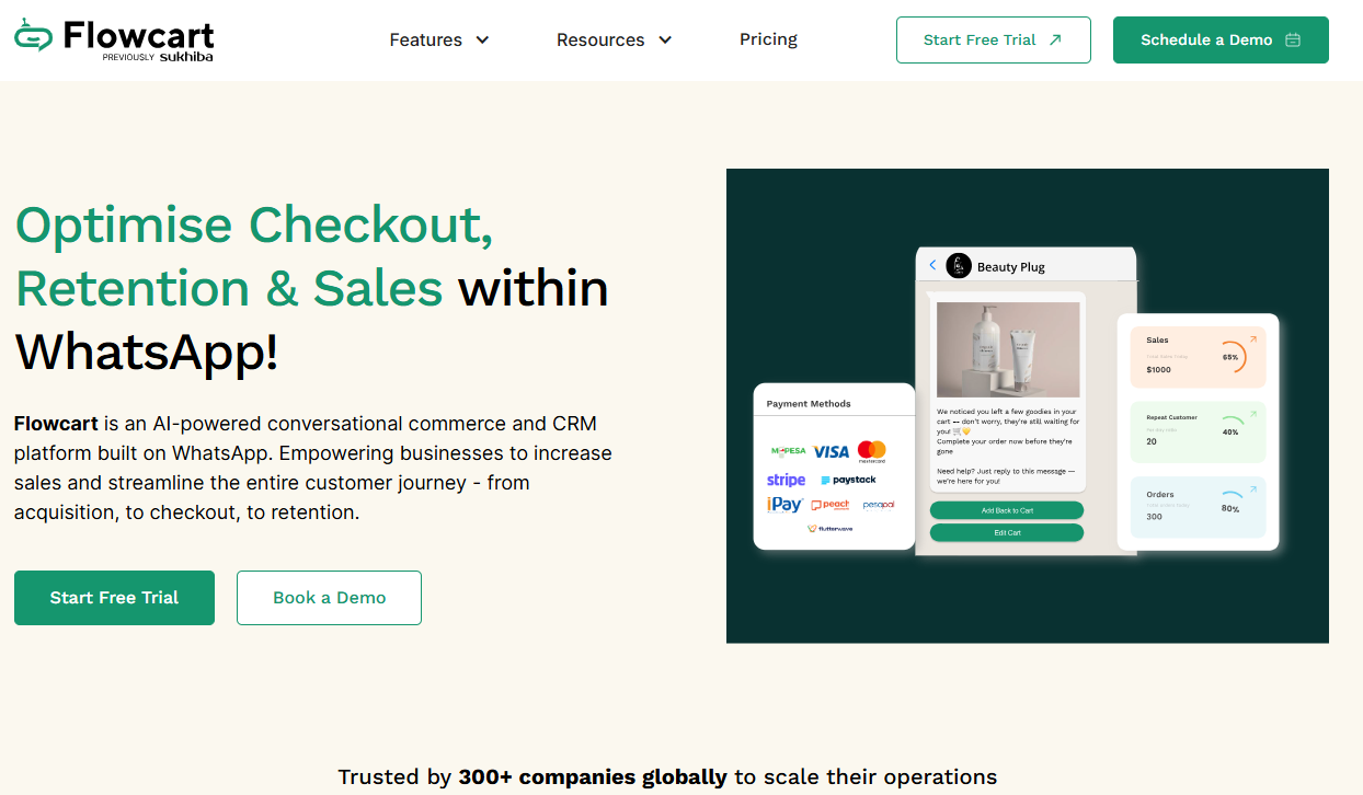It helps businesses acquire, convert, and retain customers without leaving the WhatsApp platform. With 300+ brands already using it to scale, Flowcart is designed for revenue teams that want WhatsApp to operate as a complete storefront.