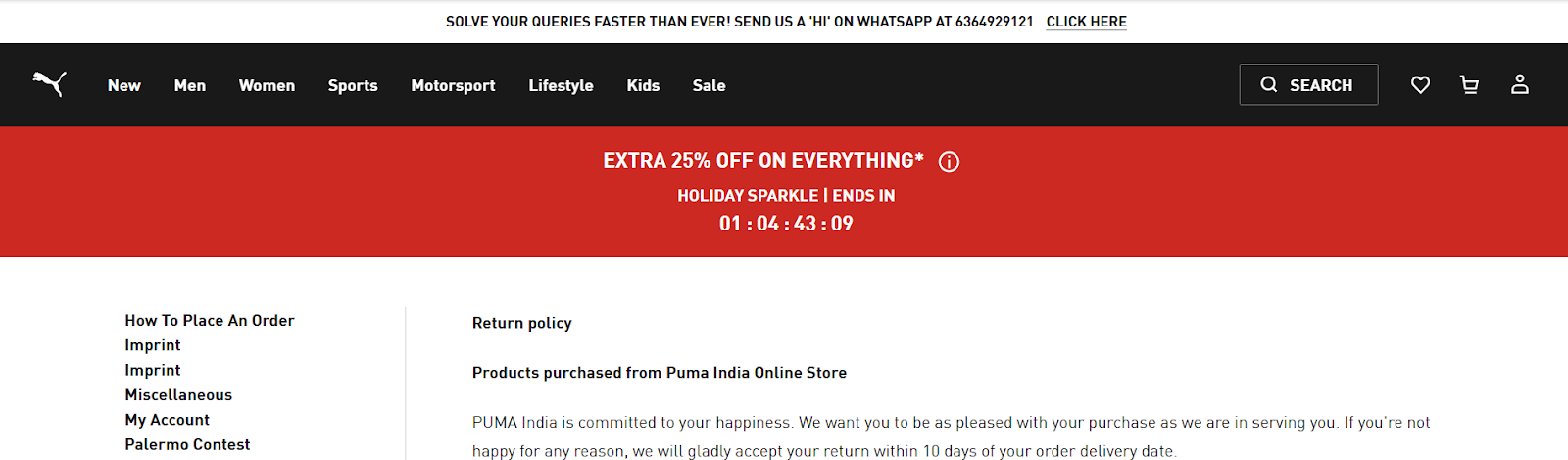 Puma does this well by displaying a website runner at the top of its site with its WhatsApp number, inviting shoppers to “Send us a Hi” for quick support. This small but powerful prompt encourages real-time conversations, resolves queries faster, and helps shoppers move forward with confidence rather than abandon the purchase.