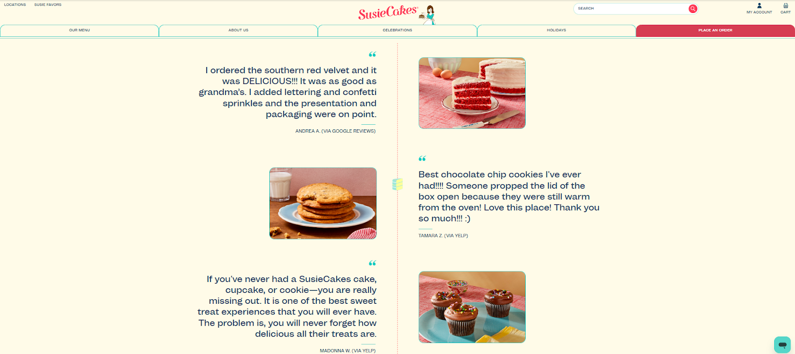 SusieCakes, the American bakery brand, highlights customer trust right on its homepage by displaying three real reviews pulled from Google Reviews and Yelp. By featuring recognizable platforms and real customer voices upfront, SusieCakes reassures first-time visitors about product quality and service.