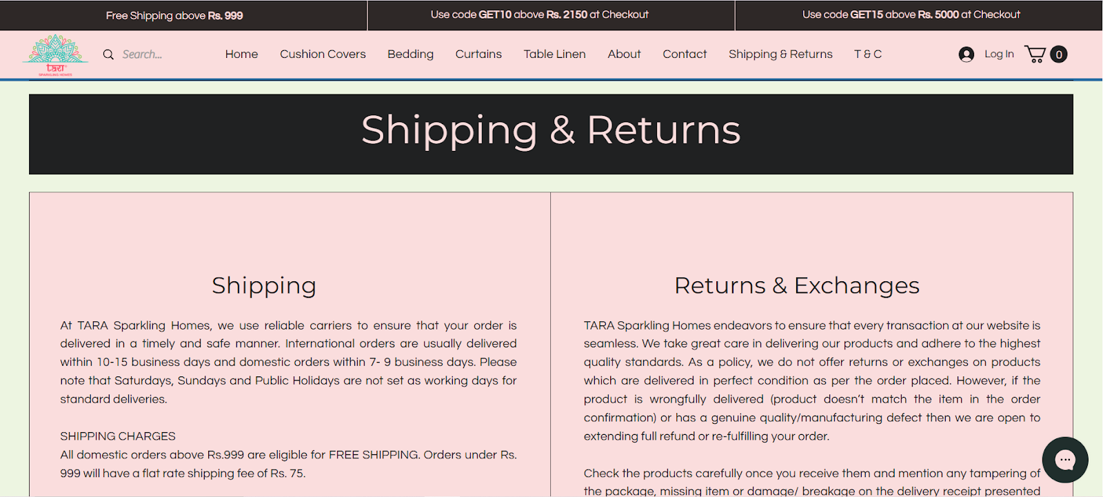 TARA Sparkling Homes clearly promotes its free shipping offer right on the home screen, highlighting free shipping on orders above ₹999. By making this information visible upfront, the brand sets the right expectations from the start and avoids unpleasant surprises at checkout.
