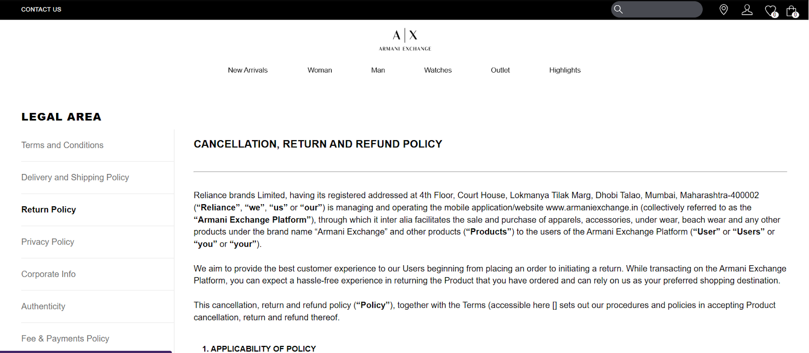 Armani Exchange makes its cancellation, return, and refund policies easy to access and understand. The brand clearly lists these policies and links them to a dedicated page that explains timelines, eligibility, and refund methods in detail.