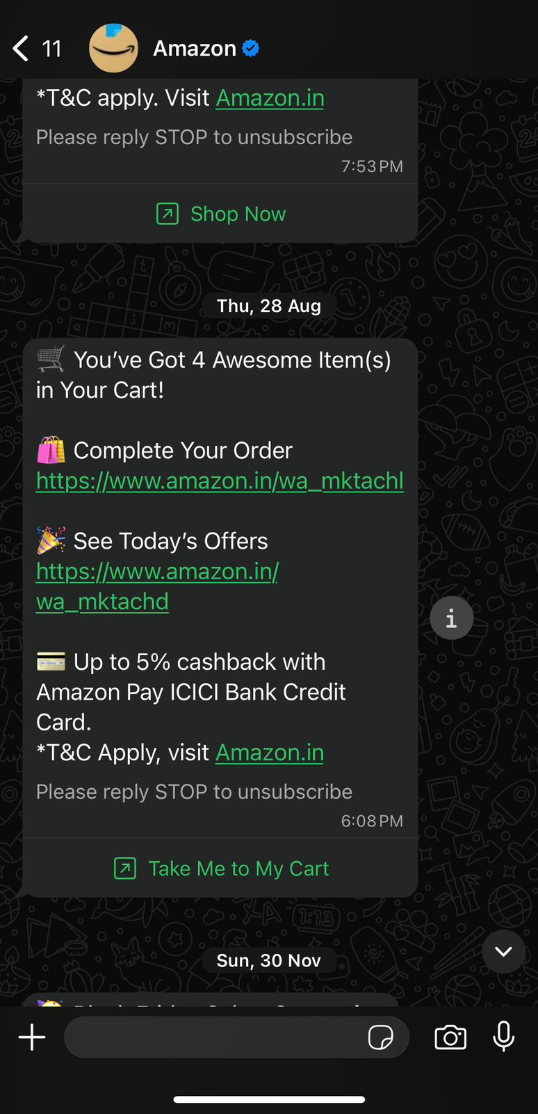 For instance, Amazon sends abandoned-cart reminders via WhatsApp with a clear “Take me to my cart” link, making it easy for shoppers to jump back in and complete their purchase with minimal friction.
