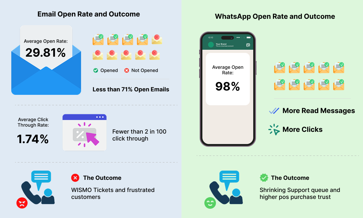 WhatsApp fixes that. Messages have a 98% open rate. More messages seen means more messages read and more clicks. Customers get real-time updates in the app they already check constantly, your support queue shrinks, and post-purchase trust goes up.