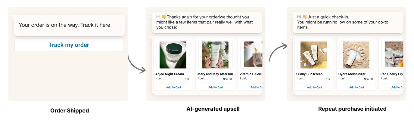 The flow: Order shipped → AI-generated upsell with complementary product suggestions → repeat purchase initiated