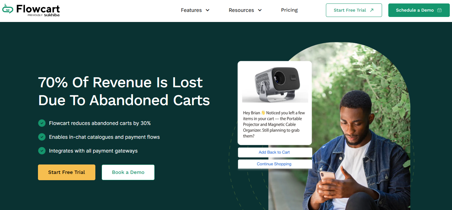 Flowcart uses post-purchase chat triggers to do exactly that, effectively serving customers with relevant product suggestions and loyalty incentives directly in the same WhatsApp thread, without sending them to a new page or an email campaign. It can also pop up with reminders for abandoned carts or uncompleted checkouts.
