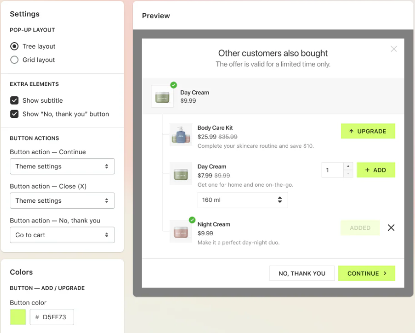This app is an ideal choice for merchants who want to offer premium services or small add-ons without cluttering their product page. The offer appears in a modal window; you can use it to pitch invisible upgrades like extended warranties, gift wrapping, or priority processing.
