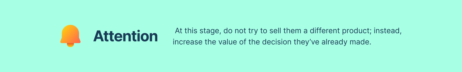 👀 Pay attention: At this stage, do not try to sell them a different product; instead, increase the value of the decision they’ve already made.