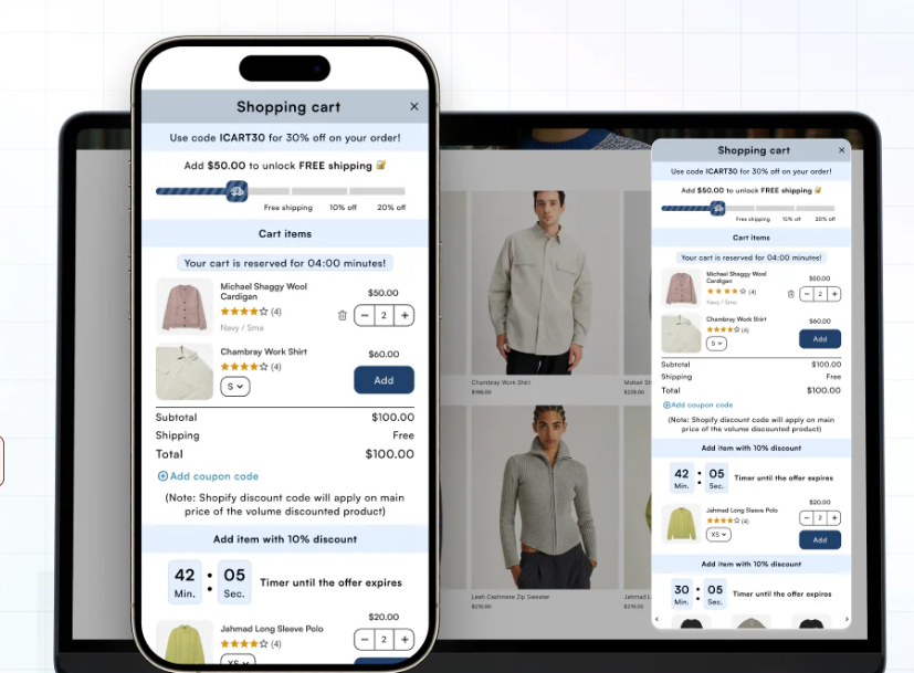 iCart is a comprehensive cart drawer editor that turns the standard Shopify side-cart into a dedicated sales funnel. You can replace the default, often static cart with a Smart Cart. It features progress bars, product recommendations, and time-sensitive offers.