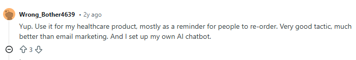 This Reddit user uses WhatsApp to re-engage past customers and nudge them to make new purchases. Technically, what you do here is send existing customers new in-stock alerts, exclusive deals, one-time offers, VIPs, and other perks to boost repeat sales.