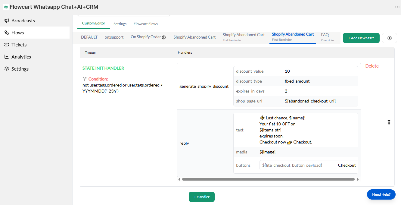 - Step 1: Go to Flows. Flowcart provides prebuilt flows for Shopify product search, order updates, cart recovery, first-time WhatsApp user discount, Shopify collection browse, and Shopify Lite checkout