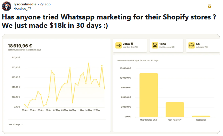 You’ve never tried WhatsApp marketing for Shopify before? No issues at all. This Reddit user did that and turned over $18,000 profits in a month.