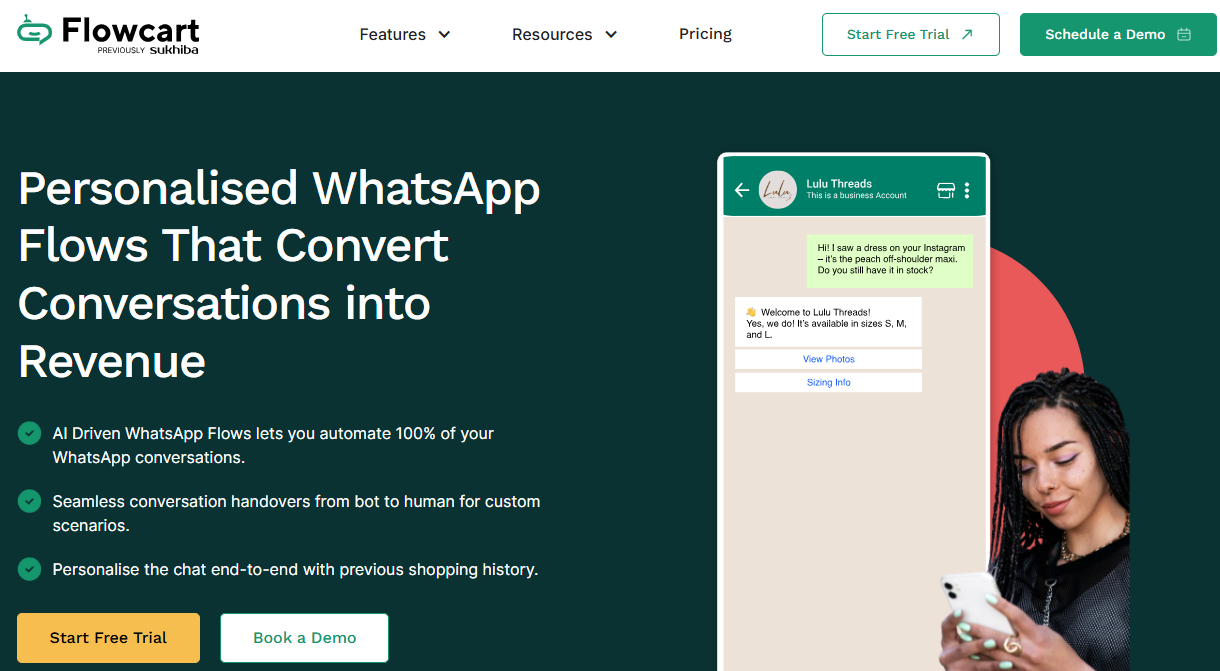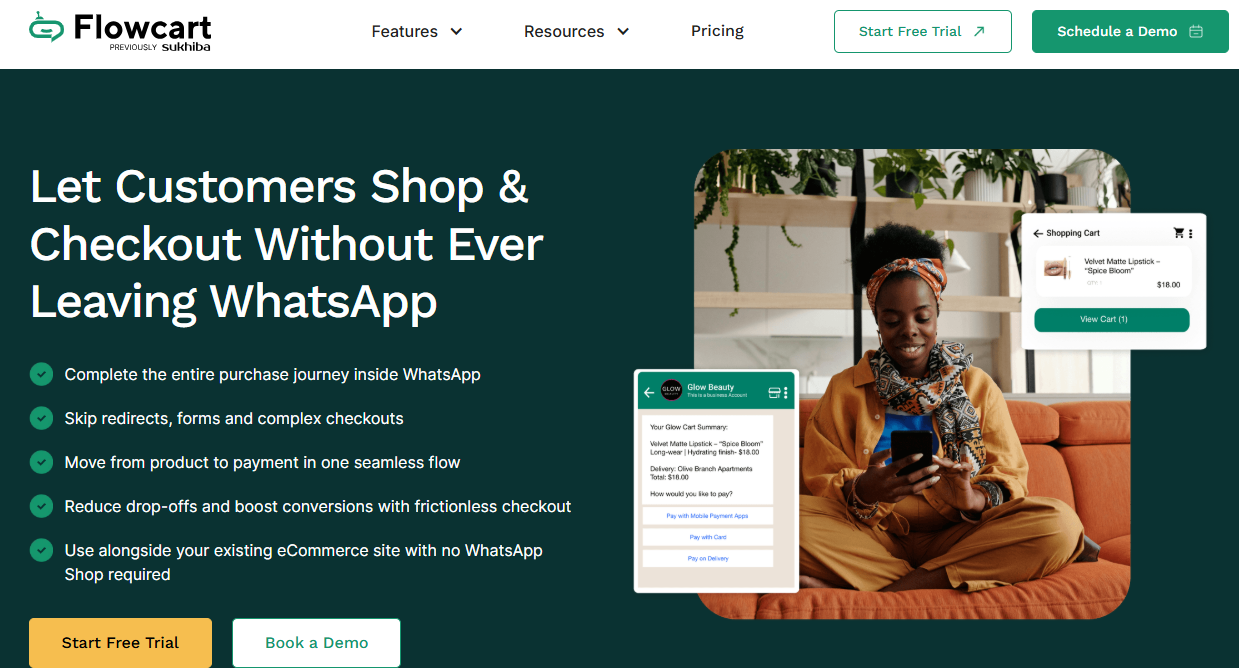 Flowcart is a full-stack WhatsApp commerce platform built for Shopify stores that want marketing, sales, checkout, and retention handled in one place. It supports real-time Shopify sync, in-chat checkout with 30+ payment options, AI-powered flows, smart broadcasts, cart recovery, loyalty programs, and AI-generated carts.Â