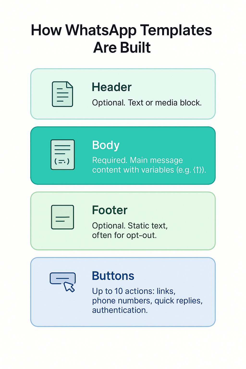 Each part of a WhatsApp template message carries its own weight, both in how the message reads and how Meta evaluates it.