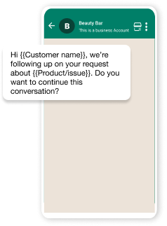 If a customer hasn’t replied within 24 hours, you need a template to reopen the conversation, which requires setting up support templates. They stay close to the problem: follow-ups, clarifications, resolution notes, or additional information requests. Any hint of promotional intent can result in the template being reclassified and rejected.