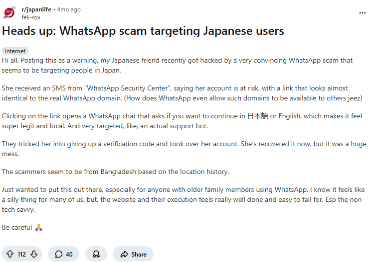 One Reddit user described how her friend’s WhatsApp account was hijacked after a scam message mimicked the official “Security Center,” complete with language options and a near-identical domain. It felt real enough that she shared a verification code.