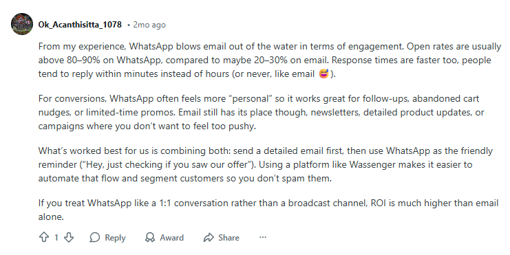 Growth strategies usually begin with audience-building: email lists, app installs, web signups, retargeting pixels. WhatsApp skips this stage entirely because the user base is already there. In many markets, it is not one of the top communication channels, it is the default behavior.