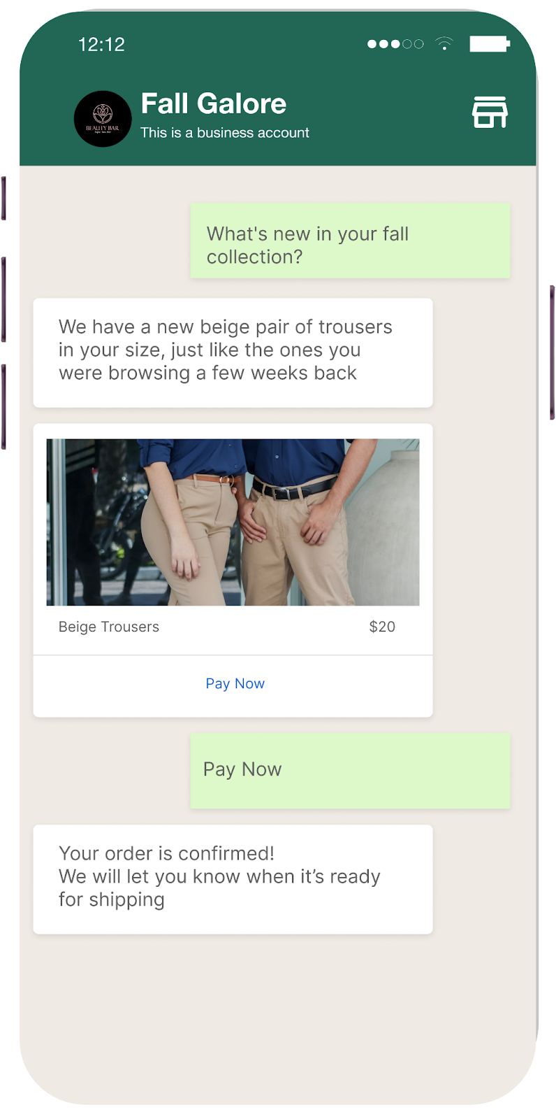 The customer selects an item, and a payment link appears in the same chat thread, prompting them to complete the transaction with a single tap. Next, the backend sends a confirmation message immediately, followed by automated shipping updates in the same conversation.​
