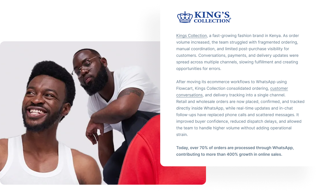 Flowcart supports this approach without requiring businesses to replace their existing ecommerce setup. Catalogs and payments integrate with existing systems, while checkout remains embedded in WhatsApp. For teams already using interactive elements, this becomes a natural next step: closing the loop from interest to purchase in one continuous exchange.