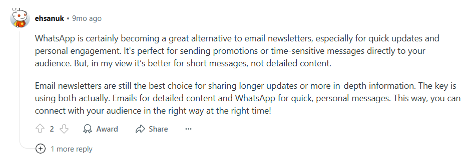 WhatsApp is not better, just different. It drives instant engagement, while email excels at long-form communication.