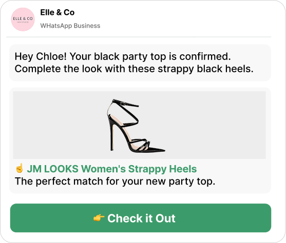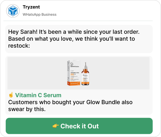Our AI looks at what each customer has bought, browsed, and shown interest in to understand what they love. When they start to lapse, it sends a personalized WhatsApp message with products tailored to bring them back.