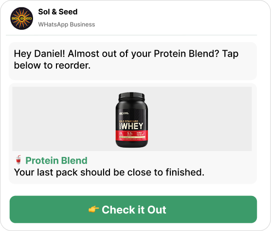 Activate reorder reminders for any consumable product. When a customer's estimated usage window ends, Flowcart nudges them on WhatsApp with a one-tap reorder.