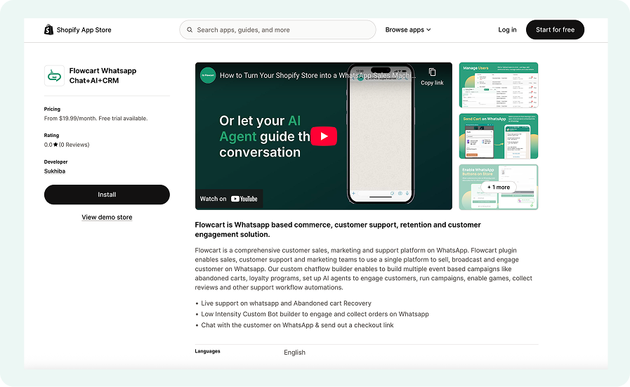 Flowcart is a Shopify plugin that turns WhatsApp into a measurable revenue channel. It helps you capture consented WhatsApp subscribers from your store using smart pop-ups and opt-in widgets, then grow sales with ready-made automations like abandoned cart recovery, reorder reminders, upsells, and win-back journeys.