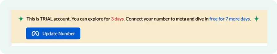 The merchant can explore the features available in the trial account for three days, with an option to extend it to seven days if they connect their number via Meta.
