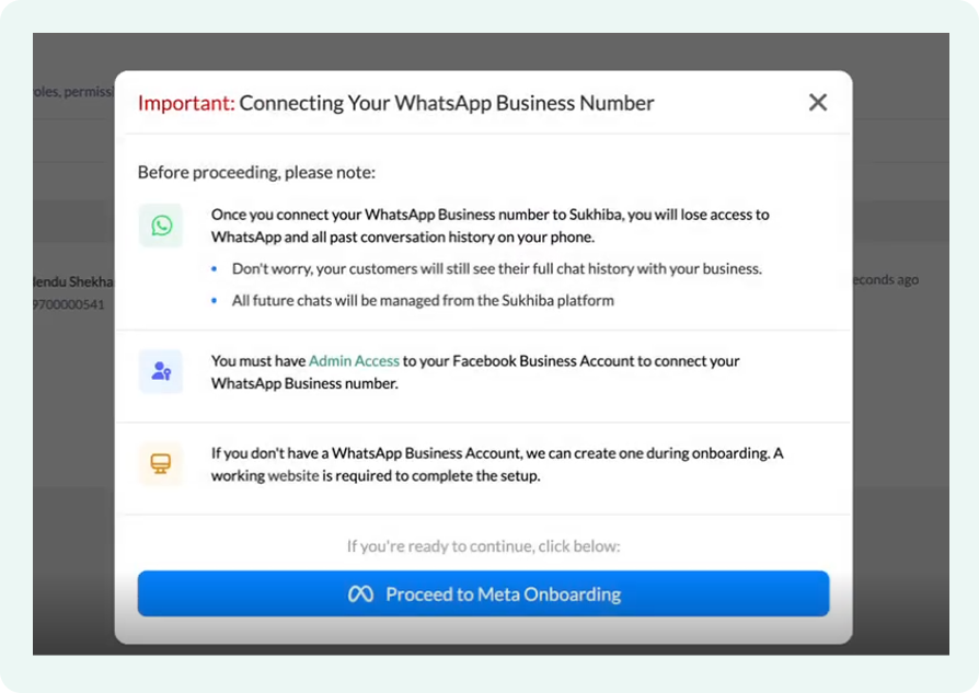 - For a seamless onboarding experience, merchants should have their Meta Business Suite and WhatsApp Business Account credentials ready. Having these at hand prevents interruptions during the final stages of the sync.