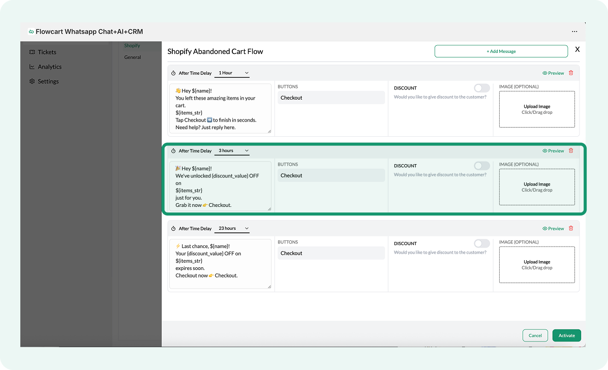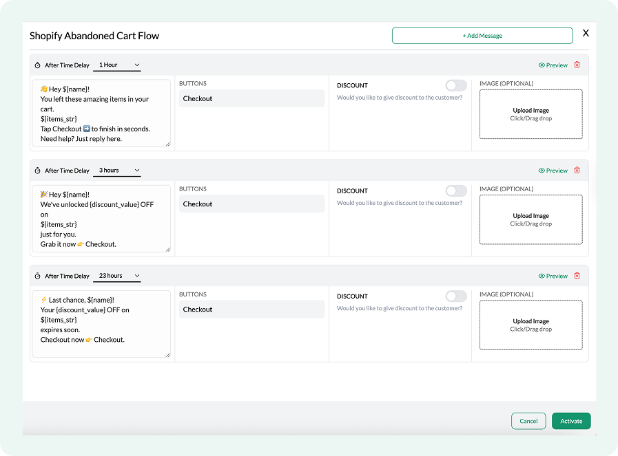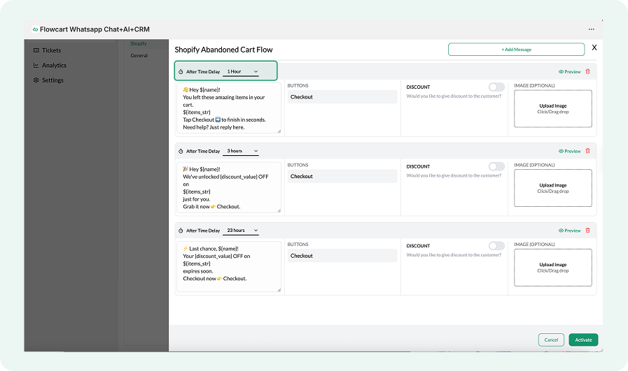 Abandoned Cart Reminder flows are configured using a single click. The Flowcart Shopify Plugin monitors abandoned checkouts. It follows up on WhatsApp with a series of reminders that include the customer’s cart items and a direct checkout link.