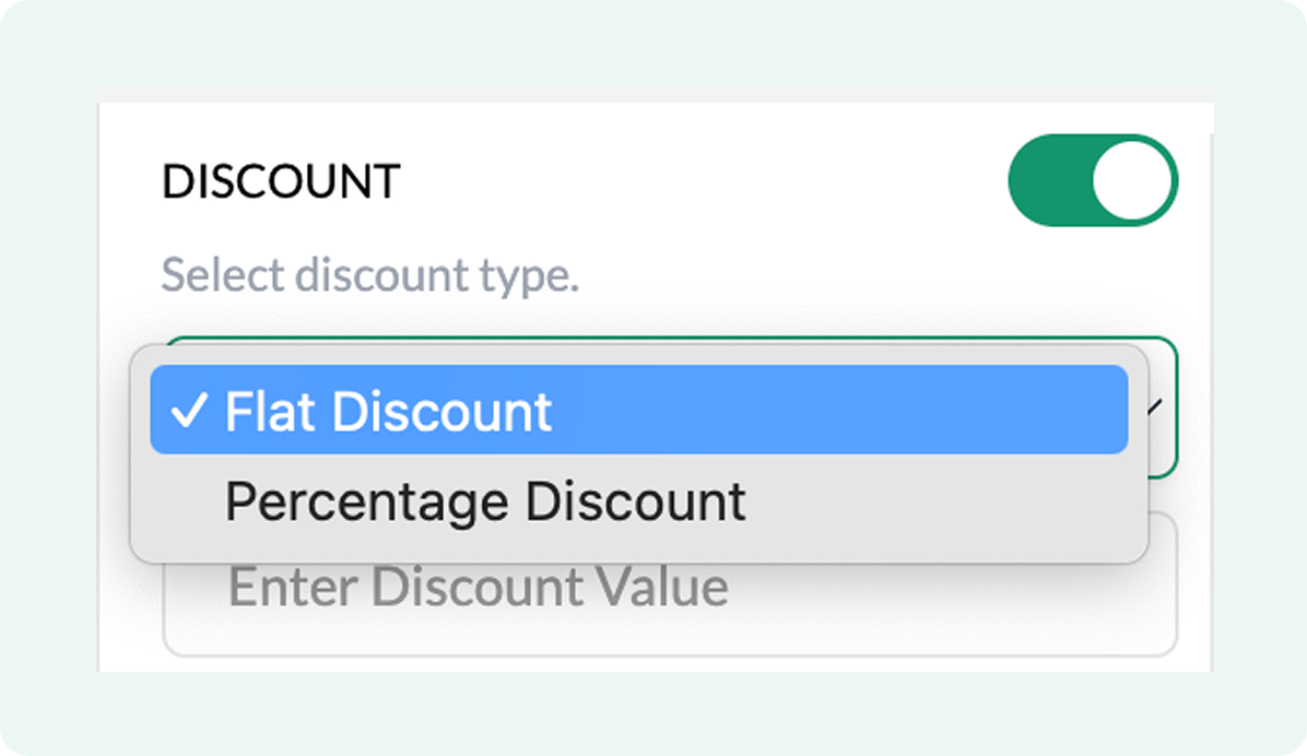 - Select a discount type. For a flat discount, select Flat, and for a percentage discount, select Percentage.