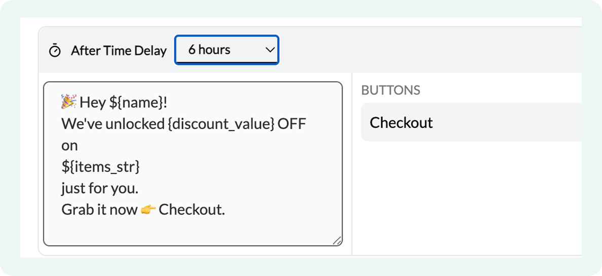 - Select when you want this reminder to be sent after a cart is abandoned (recommended timeline is within 6 hours)