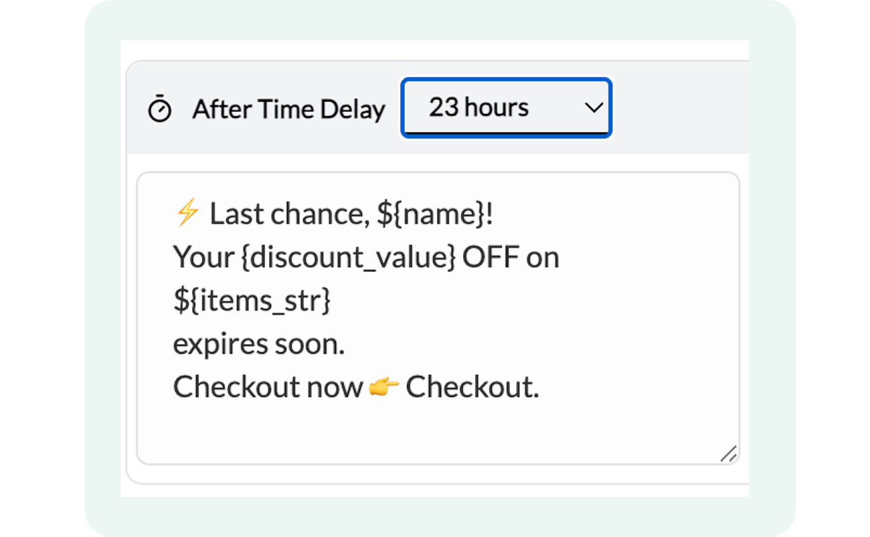 The second cart reminder follows the initial nudge and is sent if the customer hasn’t completed checkout. This step is useful for reinforcing the reminder or adding additional context to encourage the shopper to return.