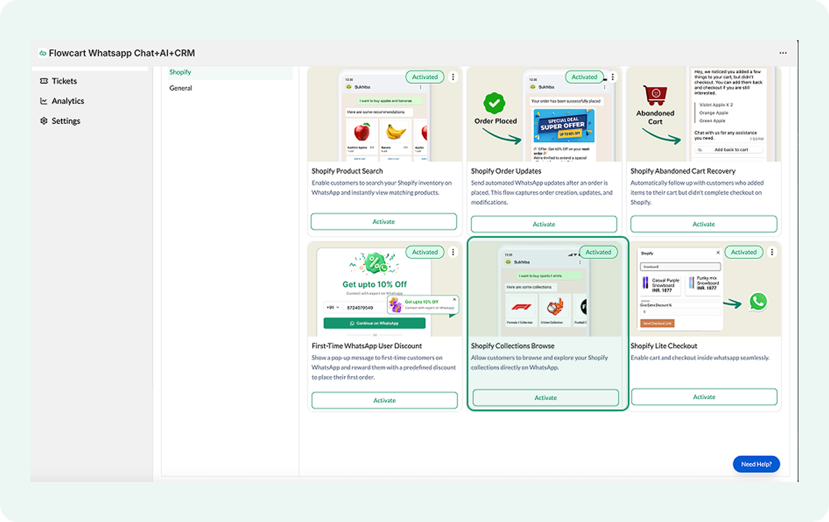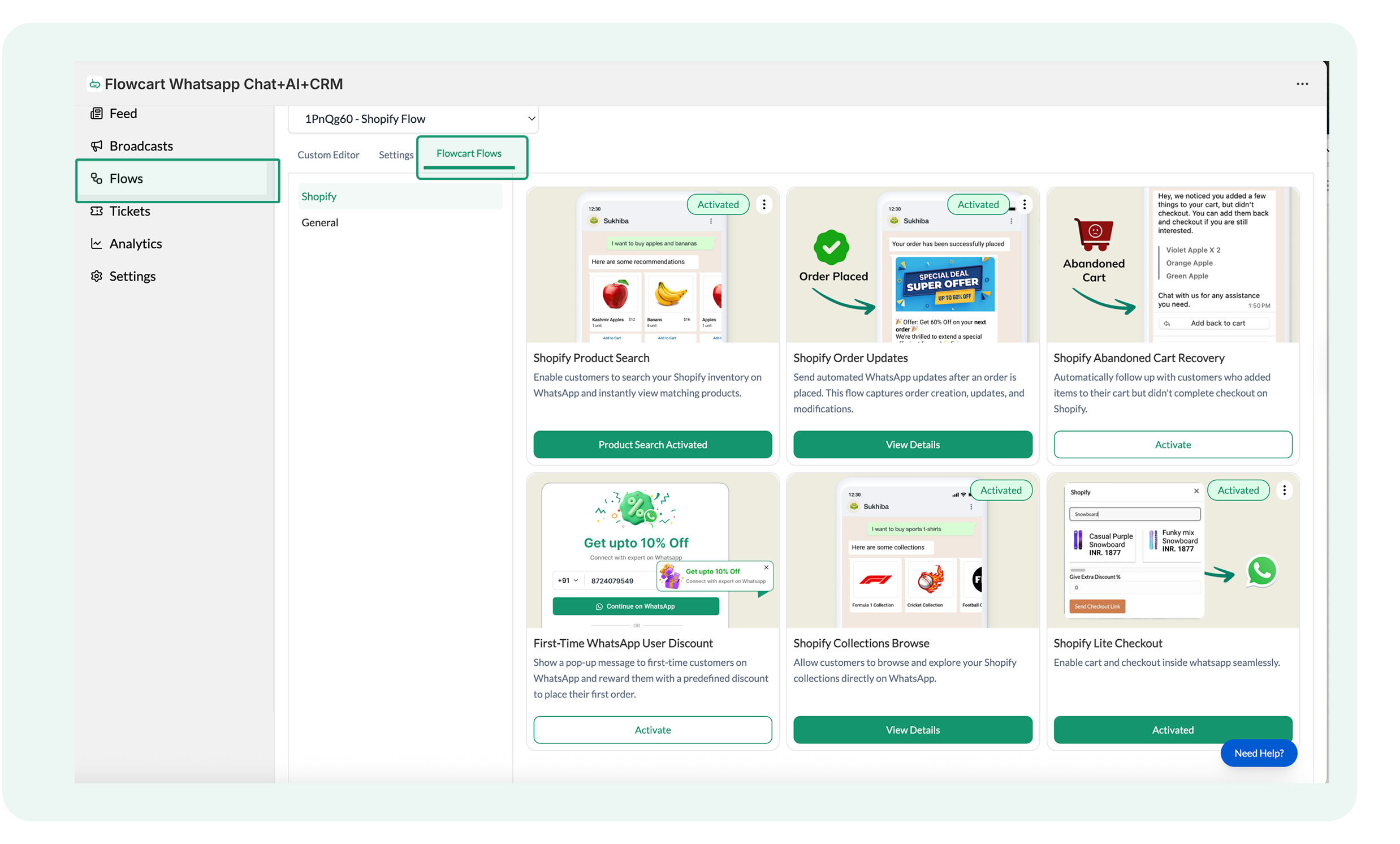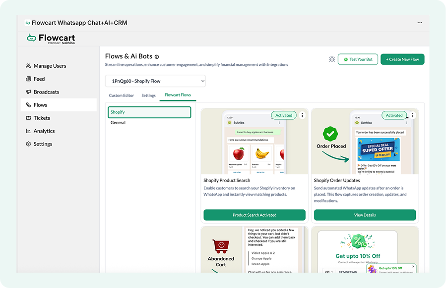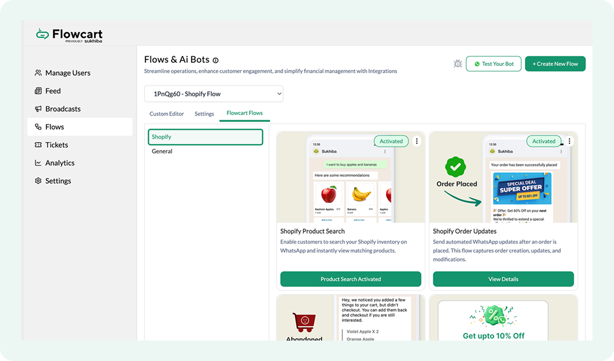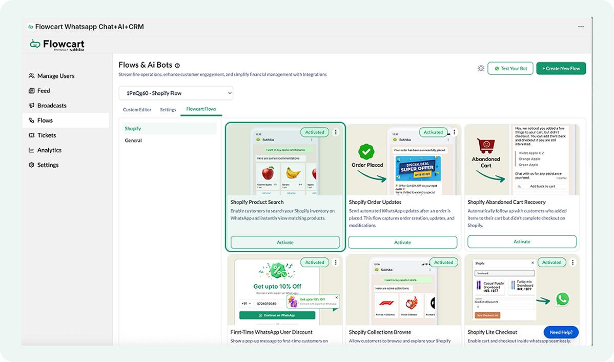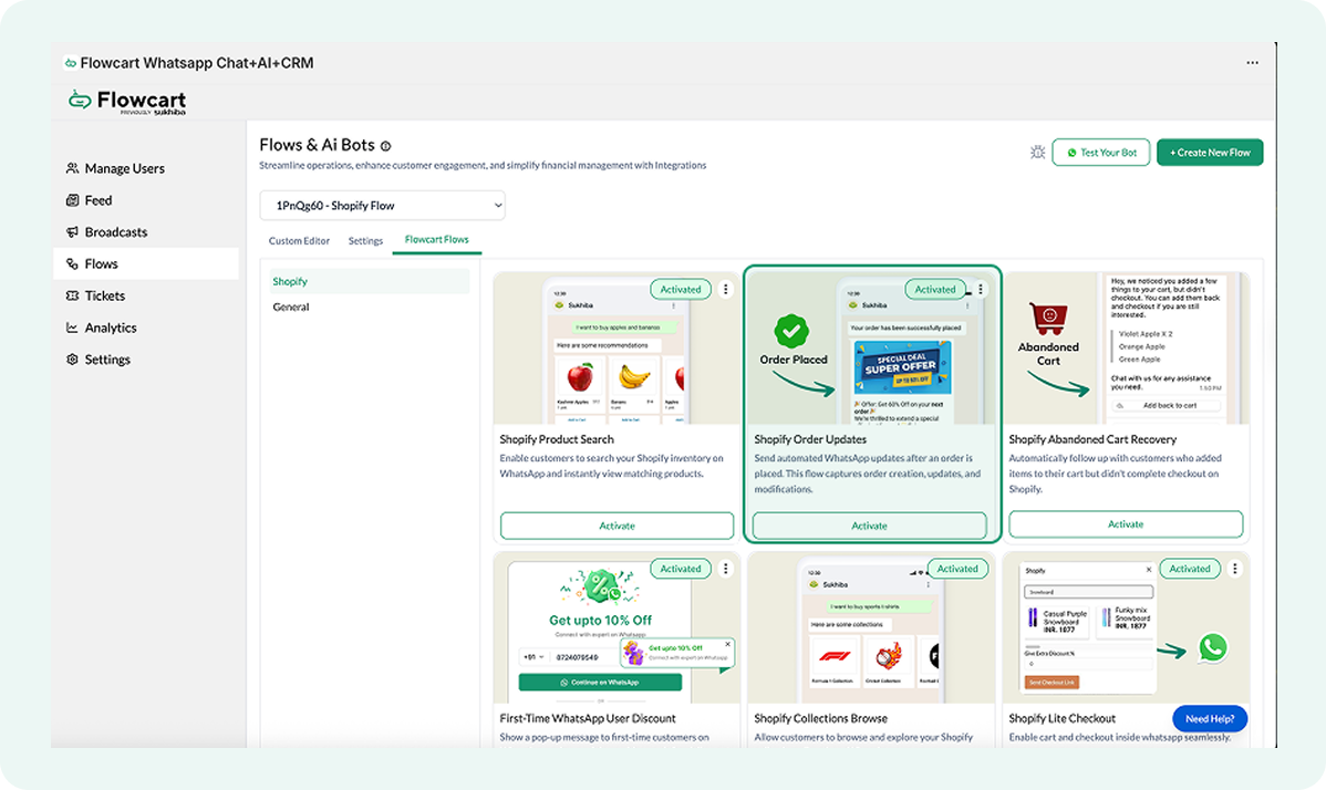 - The Flowcart Shopify Plugin installed and configured on your Shopify admin to bridge your store data with WhatsApp