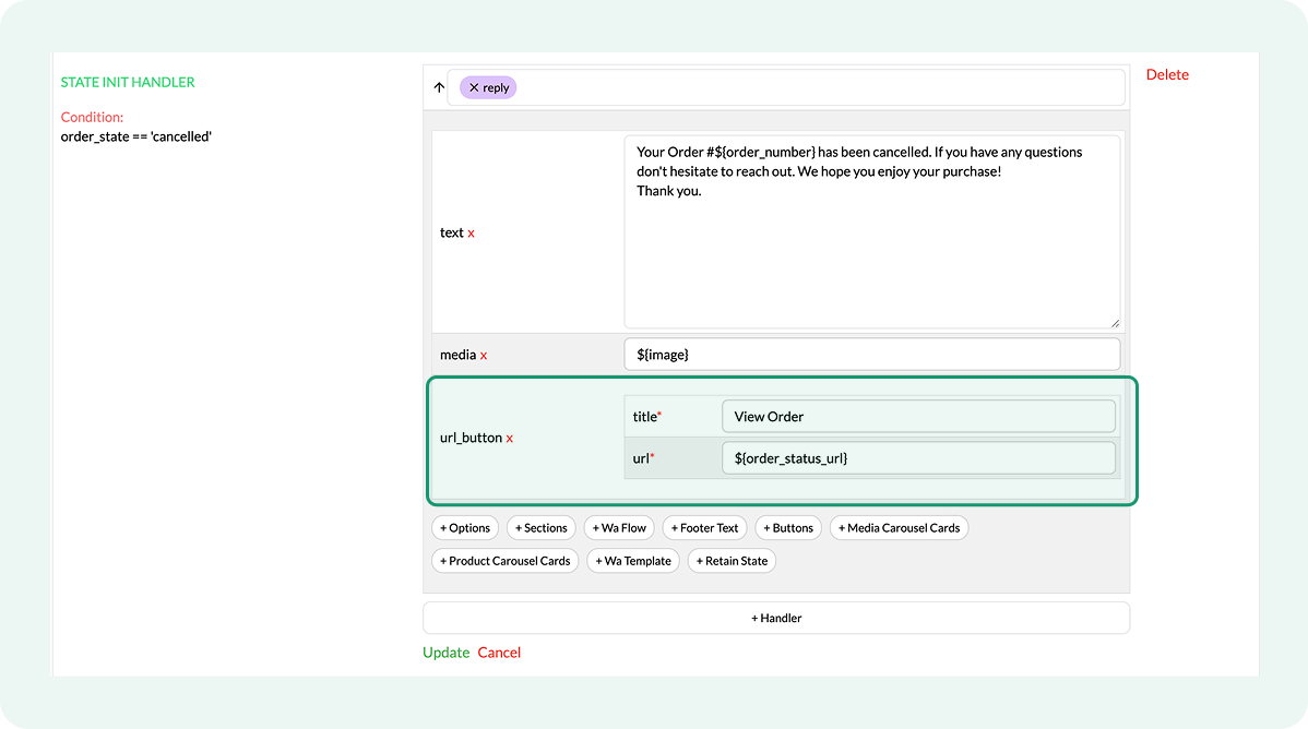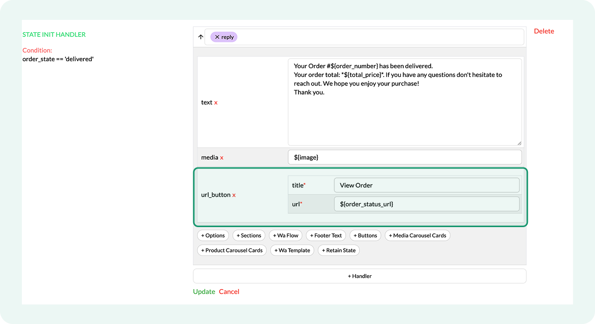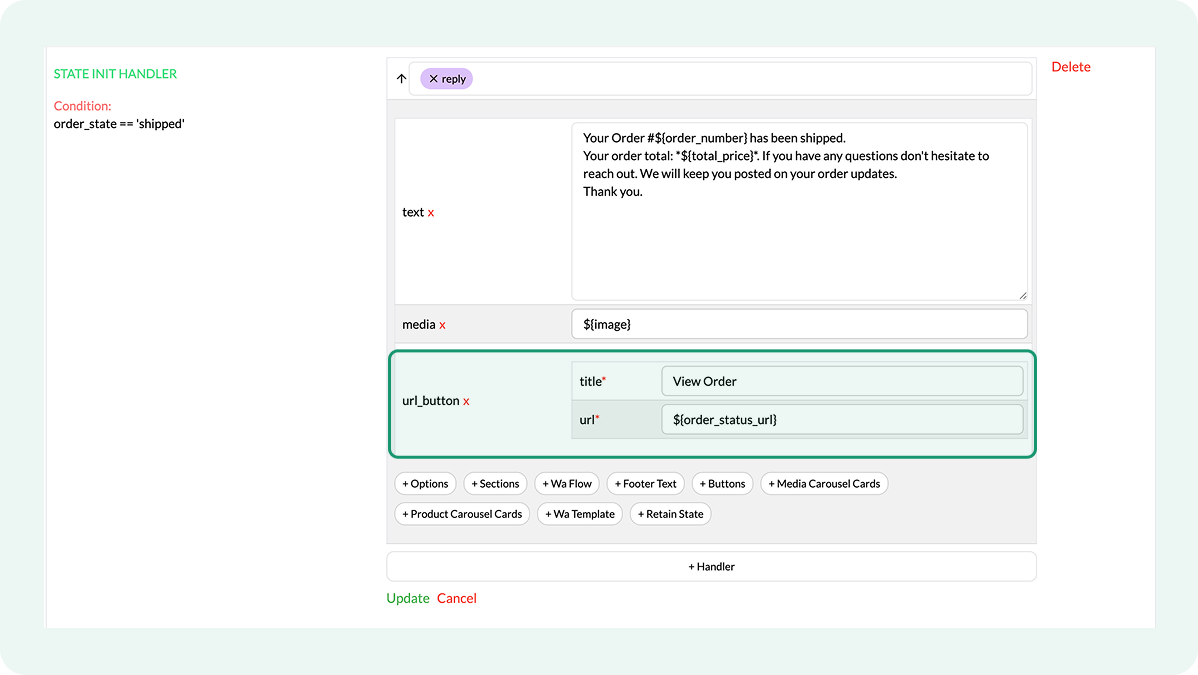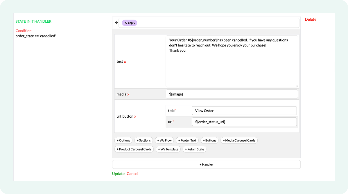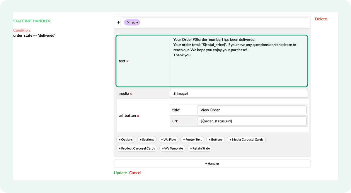Only the handlers whose order_state condition matches the order’s actual status run. If an order moves directly from one status to another, the flow sends only the update corresponding to the final status.
