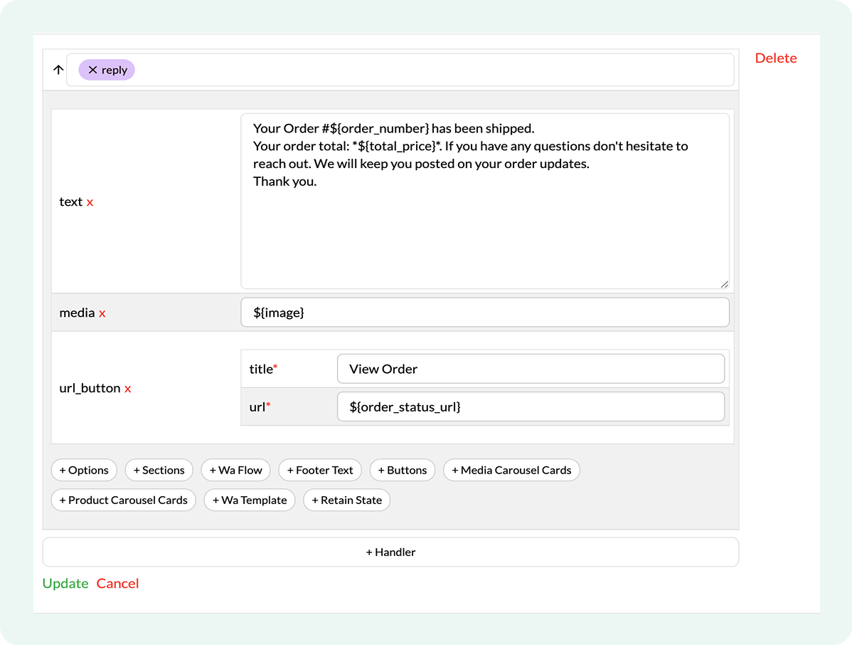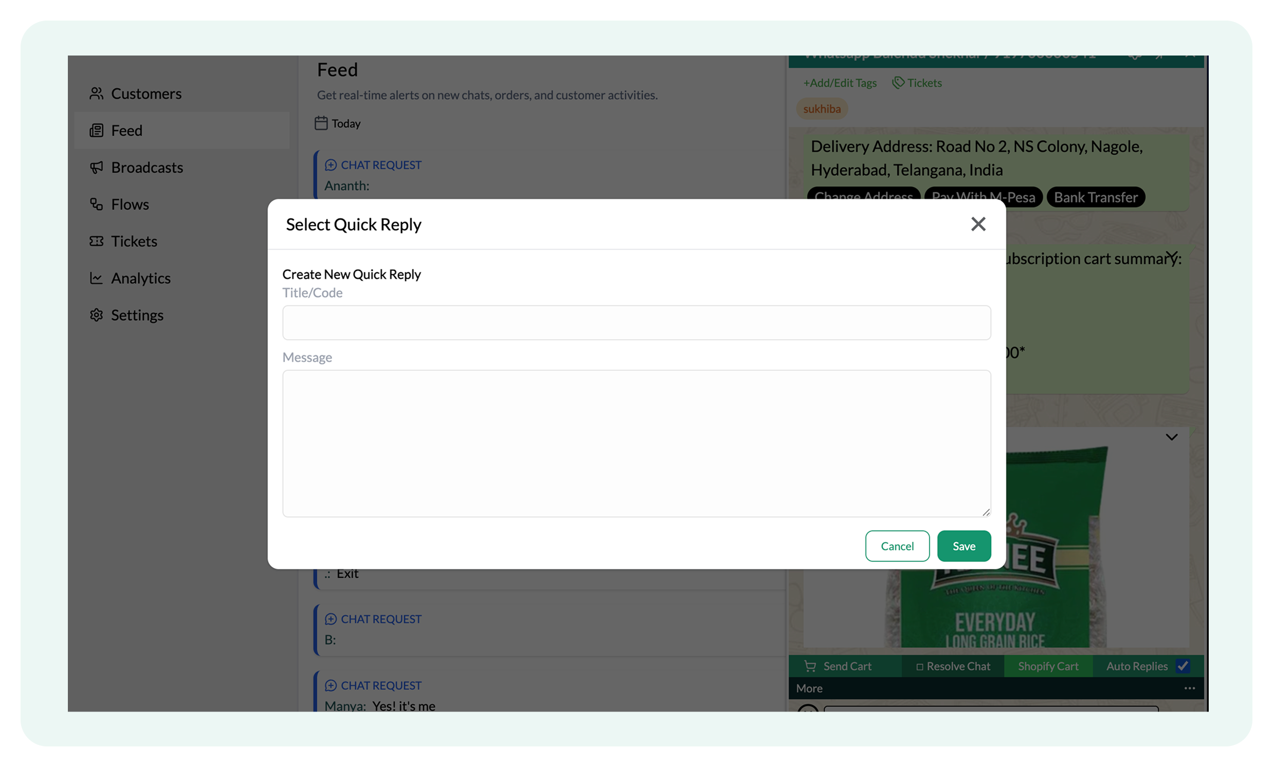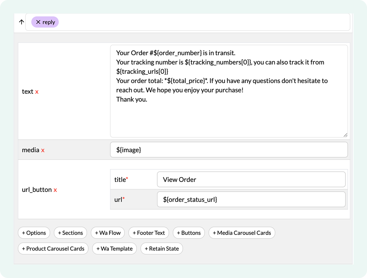 - Shopify Lite Checkout: Enable a seamless cart and checkout experience directly inside WhatsApp.