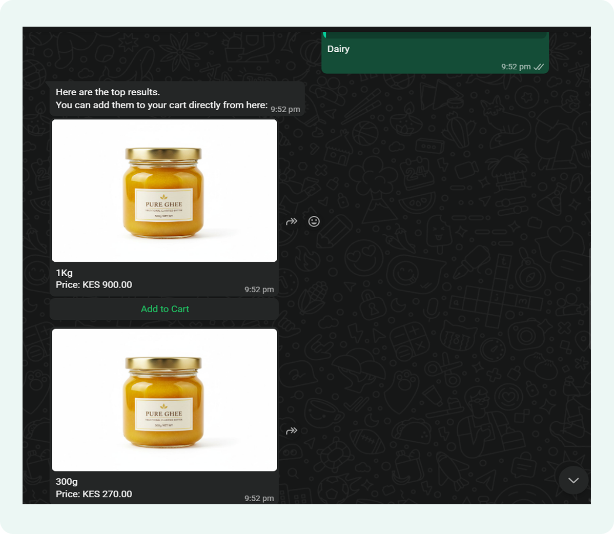 To keep the chat fast and clean, the search usually displays the top matching results first. If there are multiple matches, customers can scroll through a carousel of options to find exactly what they’re looking for.