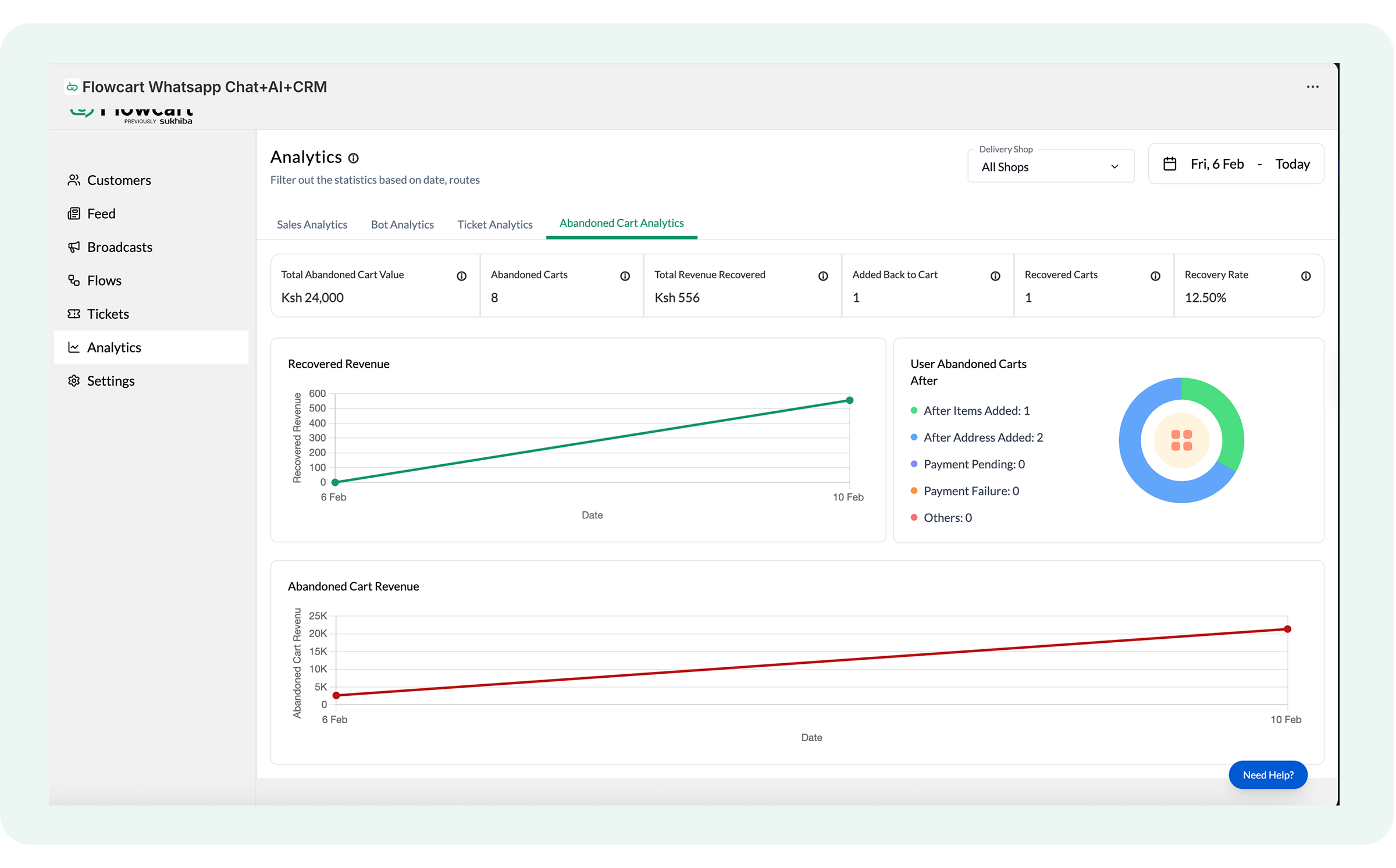 Abandoned Cart Analytics monitors the recovery of lost sales opportunities. Put simply, it tracks how many customers leave items in their carts without checking out and measures the success rate of automated WhatsApp nudges in bringing them back to complete their purchase.