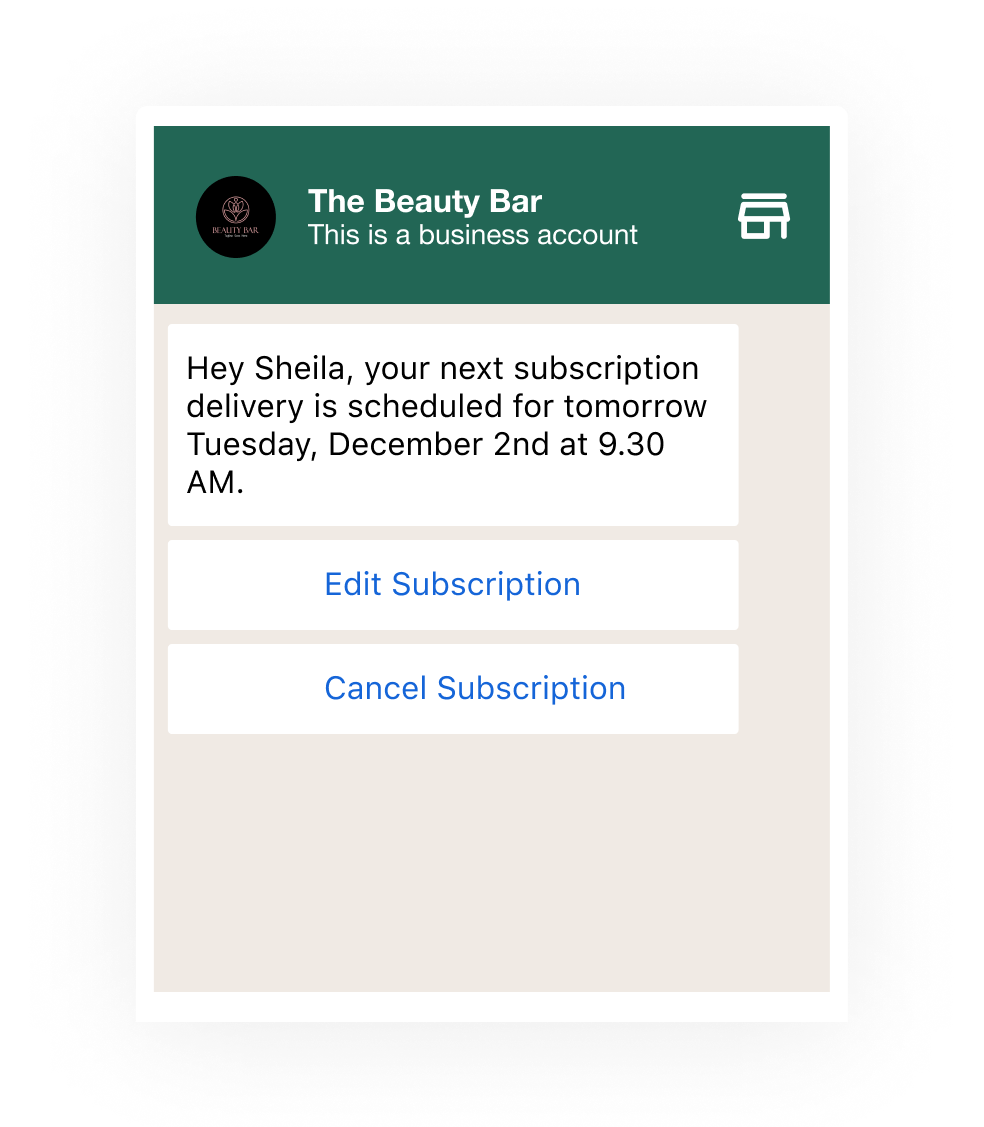 Give your customers the easiest way to reorder what they already love. Weekly, monthly, or custom schedules, all handled inside one WhatsApp chat.